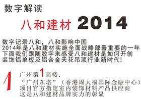 時(shí)至2014年最后一天,我們回顧,數(shù)據(jù)證明八和建材在這一年取得的成績(jī)是很好的,旗下八和建材品牌鋁單板及鋁吊頂天花產(chǎn)品以驚人的銷量領(lǐng)先于業(yè)內(nèi)其他品牌,而且八和建材品牌的影響力在眾多設(shè)計(jì)院、地產(chǎn)商及裝飾公司得到了很好的體現(xiàn)!現(xiàn)在,我們一起用數(shù)字解讀八和建材的2014年。