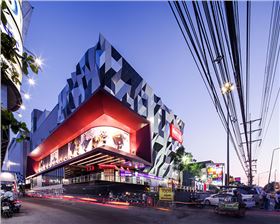 泰國TUKCOM商場的建筑外觀呈波浪形,運用了不同造型的鋁單板,分為765經濟三角像素。黑色,白色和鏡面加工的鋁單板通過超時分布的隨機算法?,F有的廣告廣告牌已擴大沿一側外墻的建筑主入口前臉標志。