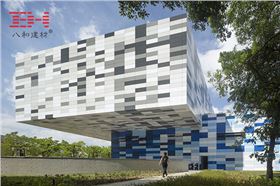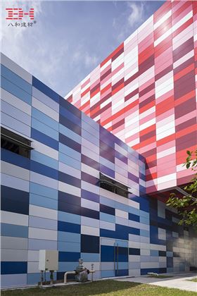 臺(tái)灣土城國(guó)民運(yùn)動(dòng)中心由三個(gè)體塊相互咬合而成,紅色的體塊(籃球館)和灰色的體塊(冰上曲棍球場(chǎng))從藍(lán)色的體塊(游泳館)外挑出了9米,從而形成了連續(xù)的半室外空間,可以供休閑漫步、室外攀巖和街舞等活動(dòng)使用。該建筑的外立面是由一種復(fù)合的窗戶/墻系統(tǒng)組成,它的前面是鋁單板幕墻,而后面則是玻璃,室內(nèi)采用鋁方通吊頂天花,這樣一方面能夠讓陽(yáng)光柔和地進(jìn)入室內(nèi),另一方面能讓使用者可以通過(guò)玻璃更好的看到室外,而室外的人卻難以看到室內(nèi),從而提供了較好的私密性。此外,外立面由一系列的漸變色組成,不同顏色的鋁單板幕墻拼在一起,起到很好的裝飾效果。室內(nèi)的鋁方通吊頂天花,有效的屏蔽上面的設(shè)施,線條飄逸,通透、典雅、高貴,功能疊加,具有透氣,散熱等功能,外形具有藝術(shù)的氣質(zhì)。