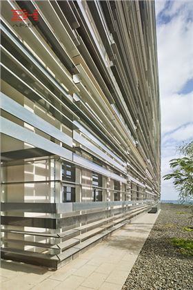 這種立面手法使得建筑表皮與自然環(huán)境產(chǎn)生交互,會隨光線、云量及其方位發(fā)生變化,帶來不同效果。