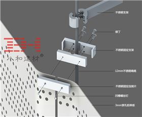 優(yōu)質(zhì)的鋁板板材如果尺寸和工程設(shè)計(jì)合理,并不需要加強(qiáng)筋強(qiáng)化面板,而建筑師在設(shè)計(jì)的時候,充分集合當(dāng)?shù)氐臍夂驐l件和力學(xué)設(shè)計(jì)原理,使用了外掛式的安裝方法,如下圖所示。