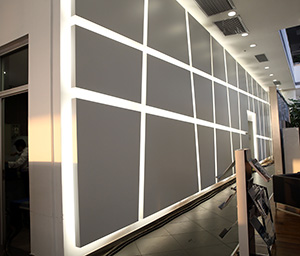 汽車4S店室內(nèi)-造型鋁單板,用作背景墻面裝飾,在燈光的效果下像圖案的拼裝