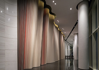 藝術(shù)背景墻鋁單板成了褶紙藝術(shù),由八和建材定制,用弧形曲面鋁單板作背板,上面組合仿木紋鋁方通產(chǎn)品,飄逸的線條,讓室內(nèi)背景變得生動(dòng)。
