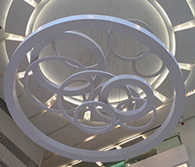 展覽館鋁天花吊頂-圓弧造型吊頂天花,大小不一的圓環(huán)組成的吊頂天花更具特色